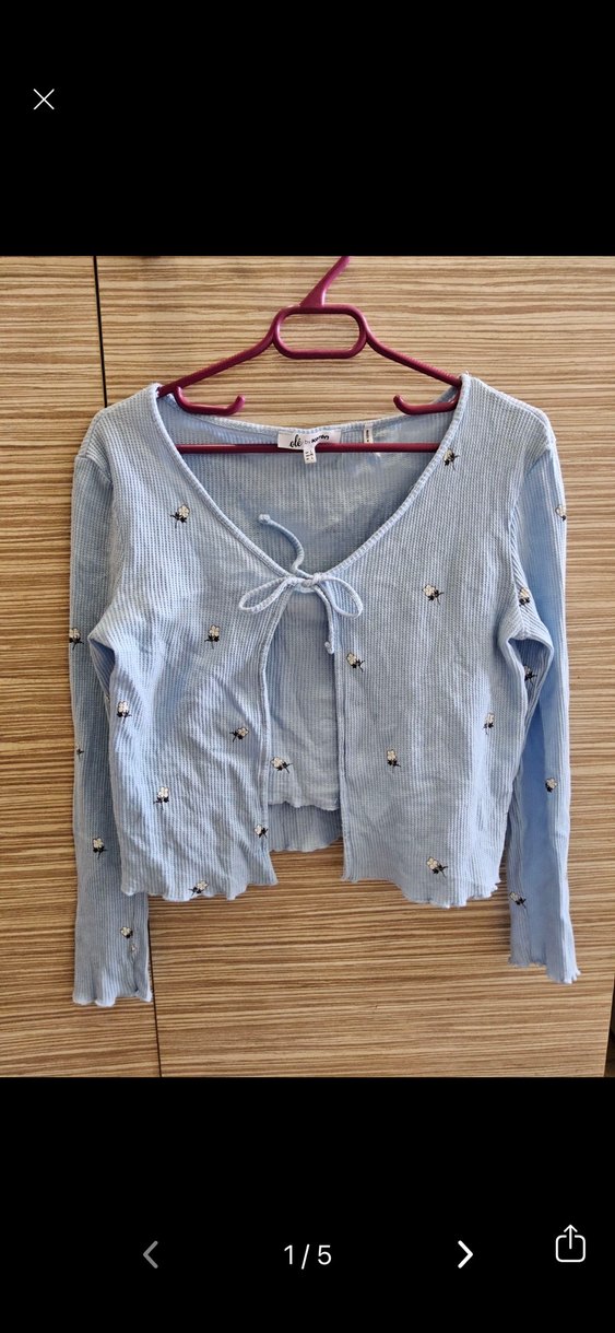 Pastel mavi renkte, uzun kollu, v yaka ve düğmeli bağcıklı nakış detaylı triko hırka. Günlük rahat sokak stiline uygundur. İki ayrı parçadır