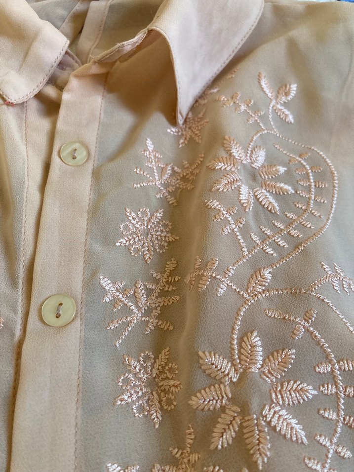 Bej renkli, nakışlı kadın gömleği, yakalı ve kısa kolludur. Düğmeli ve bol kesimdir, ipeksi kumaştan yapılmıştır, ofis kullanımı için uygundur.
