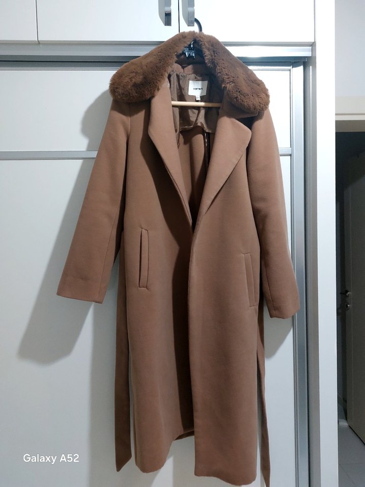camel rengi kaban, yumuşak suni kürk yakaya ve yan ceplere sahiptir. Soğuk havalar için uygundur. sayılı kullanıldı.temi