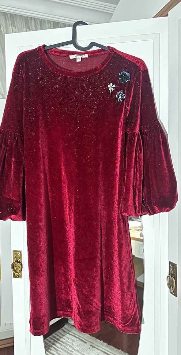 Bordo, parlak kumaştan, nakışlı detaylı, bol kesim, uzun balon kollu, yuvarlak yakalı midi elbise. SADECE 1 KEZ KULLANDIM