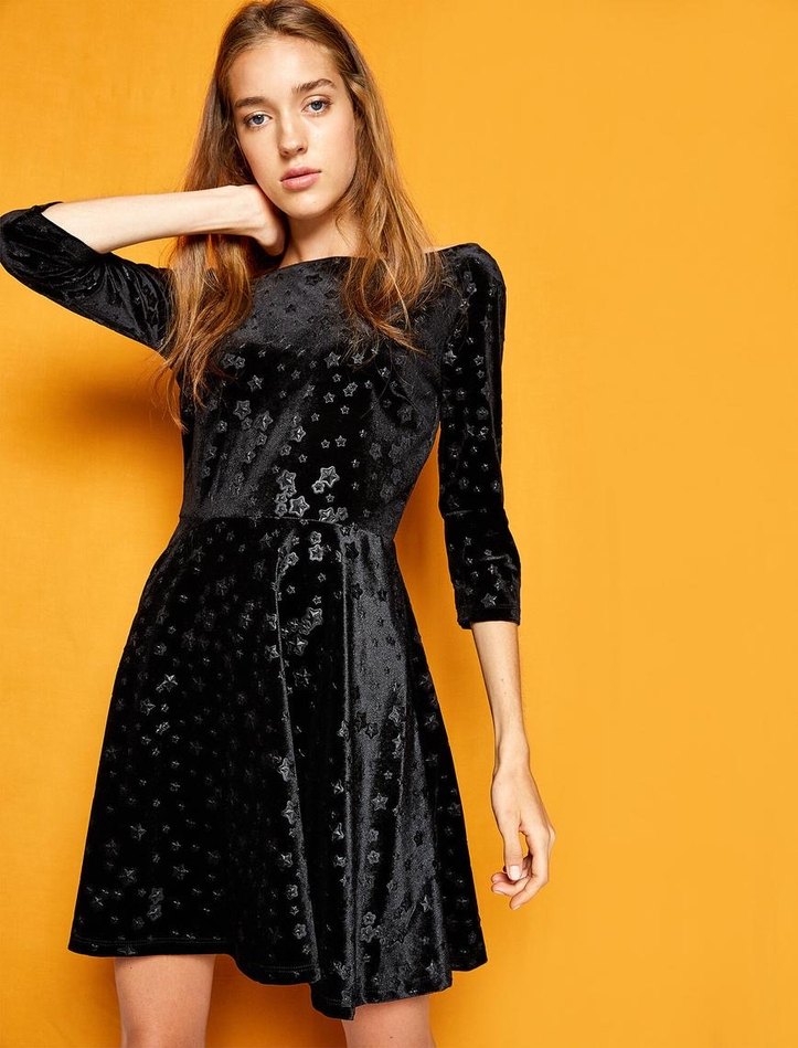 Koton Kadife Uzun Kollu Düz Siyah Elbise