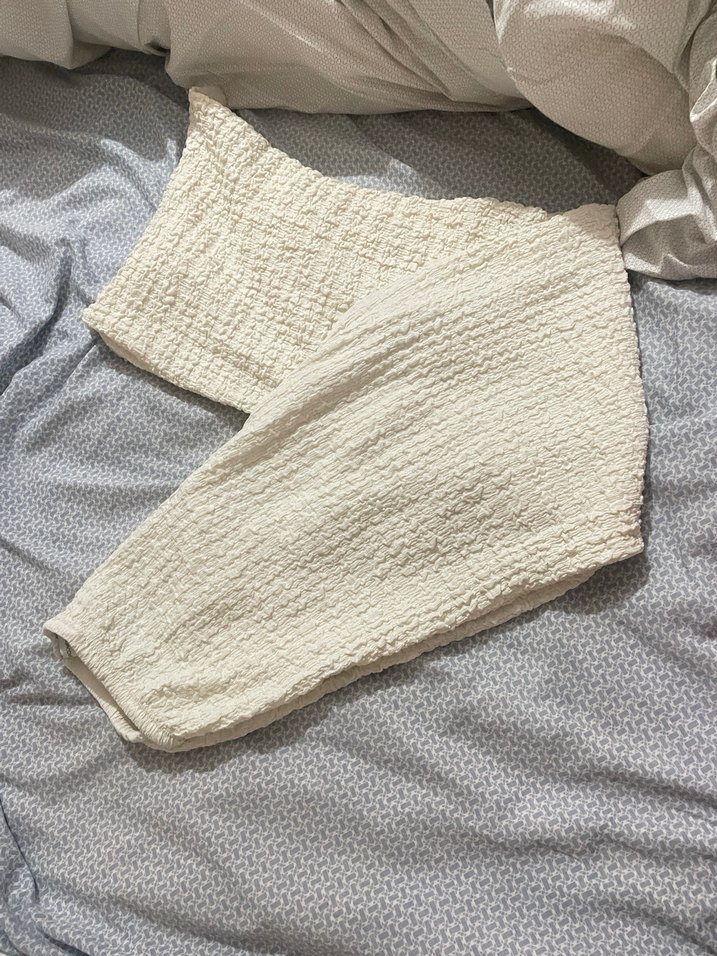 Kadınlar için beyaz, triko dokulu keten pantolon, bol kesim ve midi boy ile günlük kullanım için uygundur. Düz ve rahat normcore tarzda tasarlanmıştır.