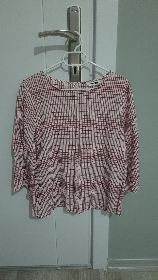 Yeni gibidir. İlki kırmızı çizgili ikincisi pudra rengi üstüne çiçekli kısa kollu bir gömlektir. Tek ürün fiyatıdır.