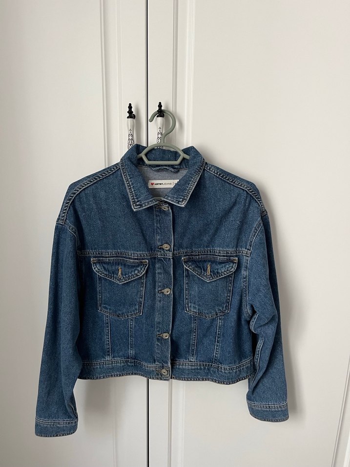 Crop modeldir. Kadınlar için mavi düğmeli denim ceket, bol kesim, uzun kollu ve yakalıdır. Normal uzunlukta, cep detaylı ve günlük kullanıma uygundur.