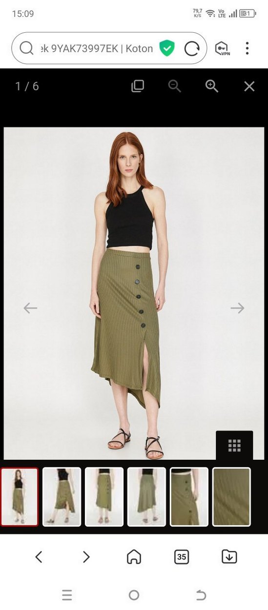 Koton marka kadın haki uzun midi etek, düğme detaylı asimetrik etek ucu ve rahat kesim, yumuşak sentetik kumaş. Sayılı giyildi ihtiyaç fazlası