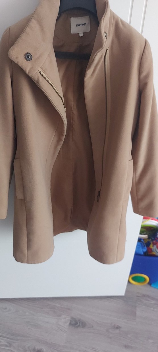 Koton marka mont, kahverengi dış yüzey ve yumuşak iç astar ile minimalist ve rahat bir tarza sahiptir.