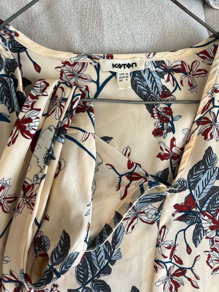 Bej renkli canlı çiçekli midi boy elbise. Boyun kısmında fular detayı var çok hoş duruyor. 1 kere tek giyildi. Arka kısmında görünmeyen lekeler var yıkamayla geçer