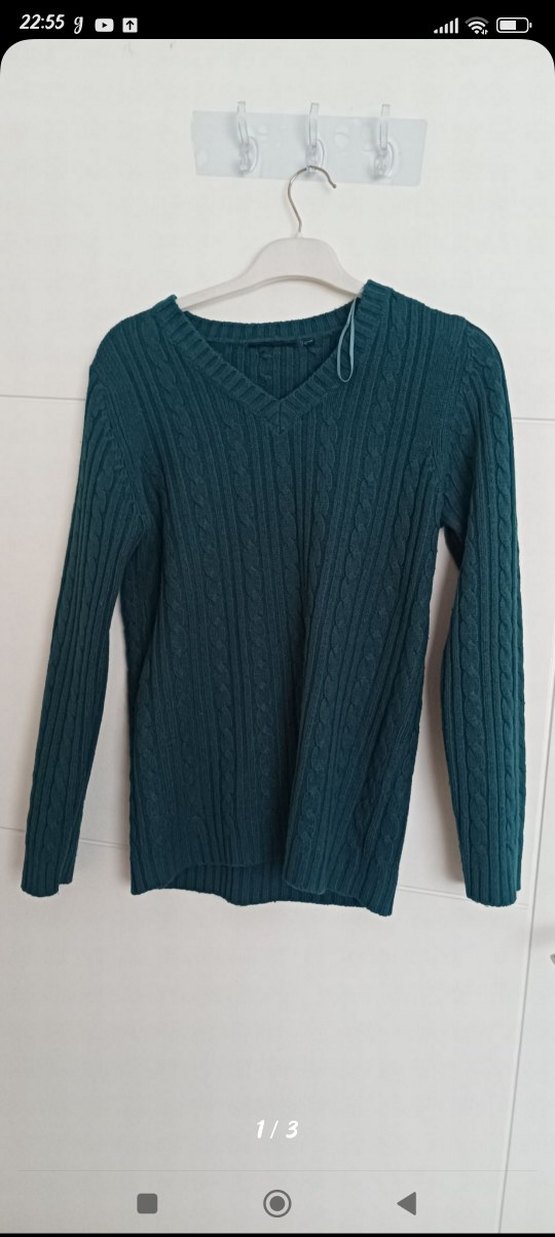 Koyu yeşil örgü kumaştan, V yaka ve uzun kollu, bol kesim normal boy kadın kazak. Rahat ve gündelik tarz için uygundur. az kullanılmış çok iyi durumda s-m bedenlere olur