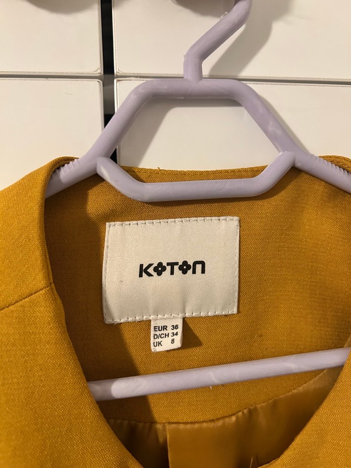 Koton markasına ait kahverengi çocuk ceketi, EUR 36 beden, yumuşak kumaş ve pastel tonlarda. Çocuk dolabı için uygun.