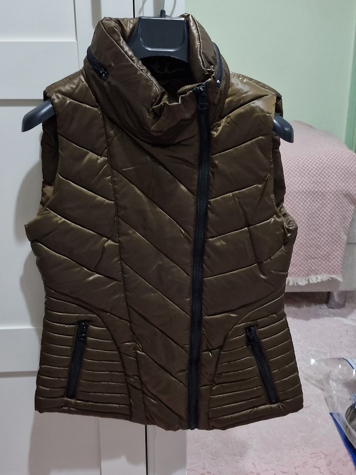 Kahverengi haki altın renginde, fermuarlı, yüksek yakalı, kolsuz ve normal boyda, dar kesim ve gizli kapüşonlu yelek.