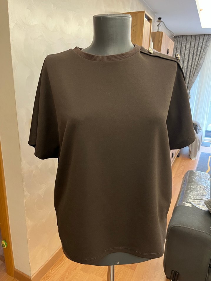 Kahverengi, yuvarlak yakalı ve kısa kollu kadın bluz, bol kesimdir. Sentetik kumaştan yapılmıştır, günlük ve rahat sokak stili için uygundur. Desensiz, sade tasarımıyla zahmetsiz şıklık sunar. ✨