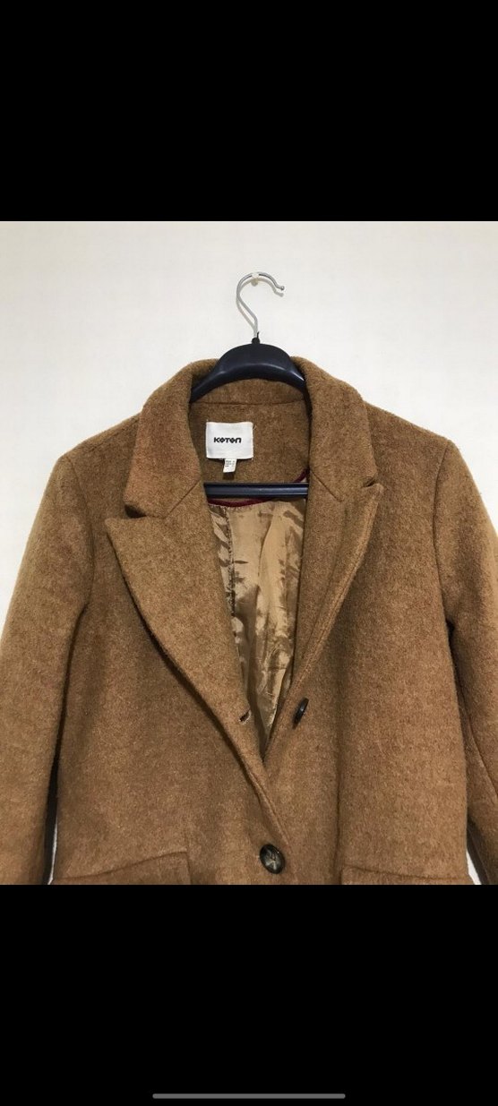 Koton markalı, kahverengi yün karışımı kumaştan yapılmış, klasik yaka ve düğmeli kapanışlı kaban. İç kısmı astarlıdır ve ön ceplere sahiptir.
