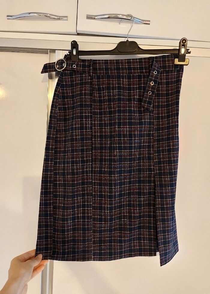 Kesik etiketli koton etek belimin yanlarında Kemer tokatlarım var croplarla güzel duruyor. Sol bacağın önünde yirtmac var aşırı seksi. Kilo almadan önce 1 2 kere giydim.