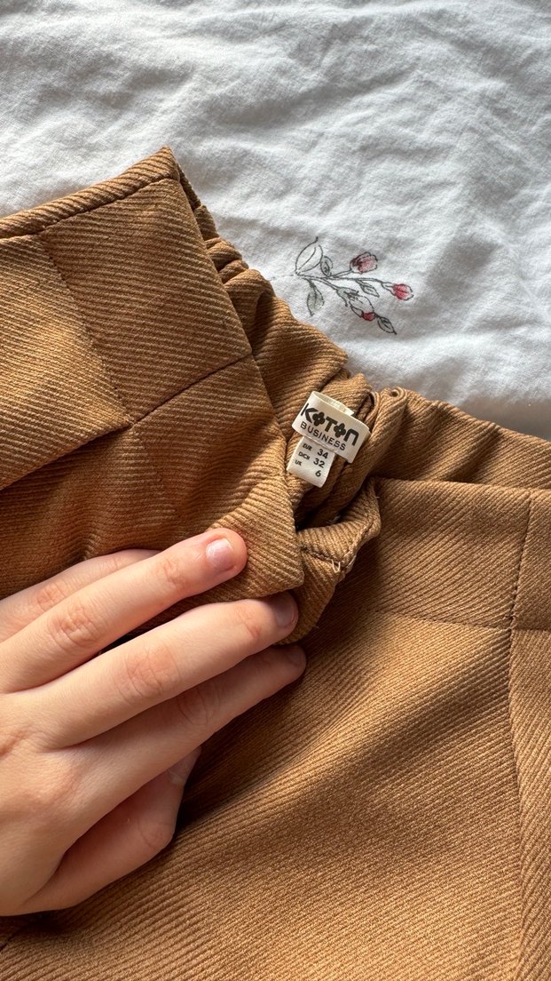 Düğmeli detaylı, kahverengi keten kumaştan, midi boy ve fitted kesim kadın pantolon. Rahat ve şık, günlük kullanıma uygun.
