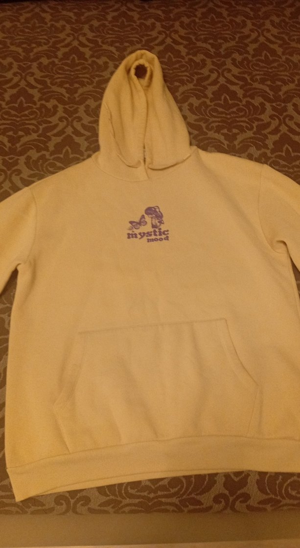 Bej kapüşonlu sweatshirt, rahat kesim ve uzun kolludur. Yumuşak ve sıcak kumaştan üretilmiş, baskılı deseni ve ön cep detayı bulunur.