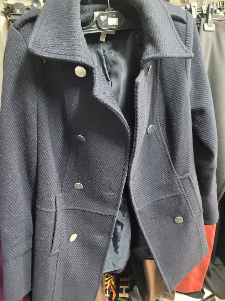 Lacivert renkli kaban, çift sıra metal düğmeli ve dokulu kumaşlıdır. Geniş yakası ve iki cep bulunur. İç kısmı astarlıdır.