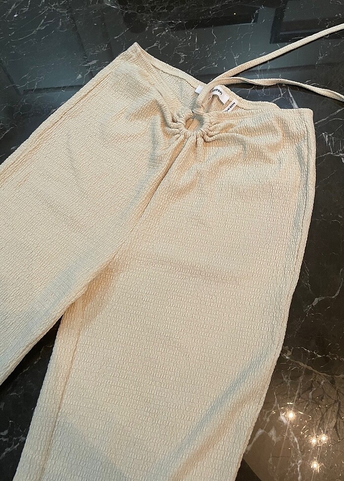 Bel bağlamalı detaylı sahile çok yakışacağını düşünüyorum keten pantolon krem