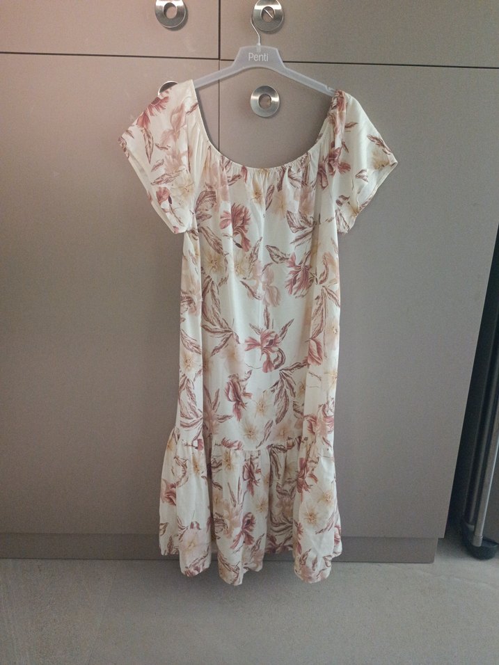 Kısa kollu, straplez yaka, bol kesim elbise. Bej pastel renkli desenli ve dökümlü tasarım, günlük kullanım için uygun.