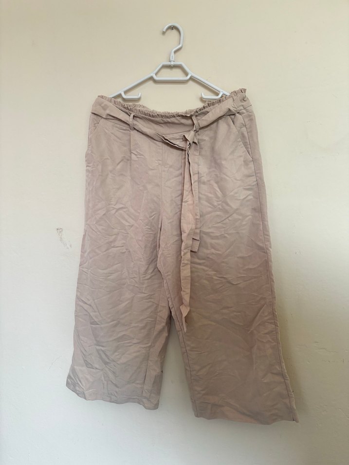 42 Beden KOTON marka pantolon. Bej renkli, keten kumaştan, kemerli ve bol kesim midi uzunlukta. Minimalist ve günlük kullanıma uygun rahat stil sunar. Bahar ve yaz mevsimlerinde kullanıma uygun.