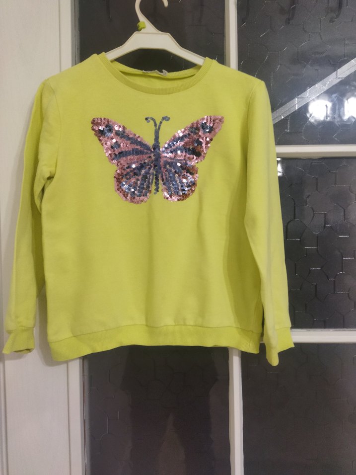 Koton kids marka 9_10 yaş kız çocuk kalın penye tişört az kullanılmış bir sorunu yok on tarafı pul işlemeli uzun kollu ölçüsü koltuk altından koltuk altına genişlik ölçüsü 42 cm boy uzunluğu 48 cm ihtiyaç fazlası Sarı renkli, uzun kollu ve yuvarlak yakalı kız sweatshirtü. Önünde renkli payetli kelebek deseni bulunur, bol kesim ve sentetik kumaştan yapılmıştır.