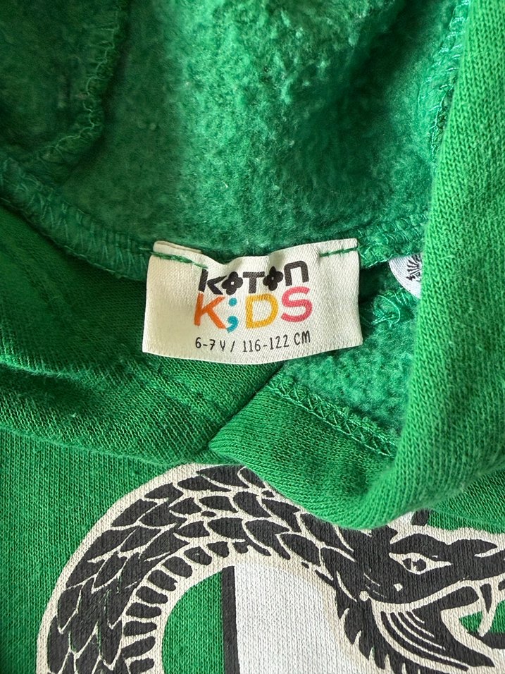 Koton Kids'in yeşil kapüşonlu erkek sweatshirdi, uzun kollu ve fermuarlı. Yumuşak fleece kumaştan, bol kesim ve parlak baskılı desenli, rock punk tarzına uygun.