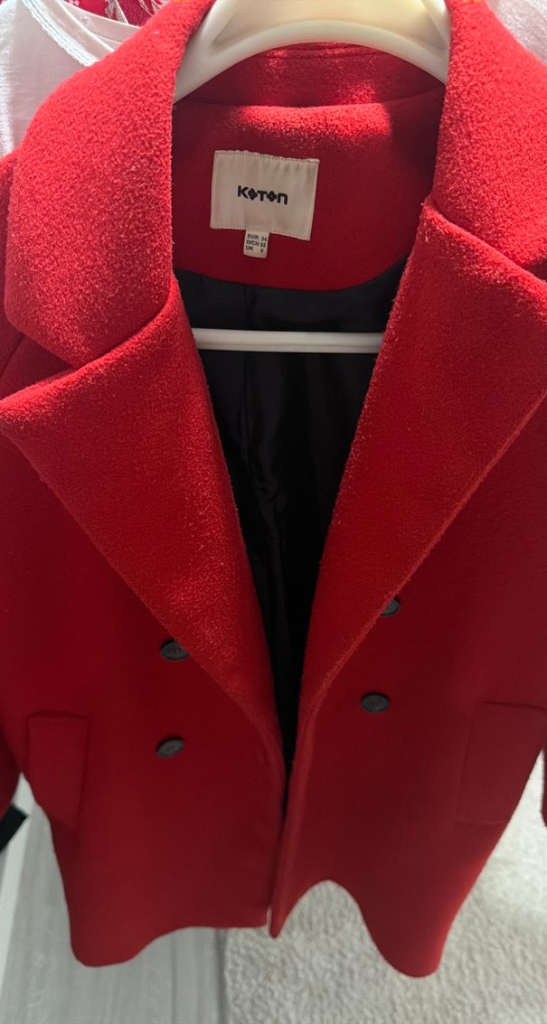 Koton markasına ait kırmızı, çift düğmeli ve yumuşak dokulu kaban. Soğuk havalar için uygundur.