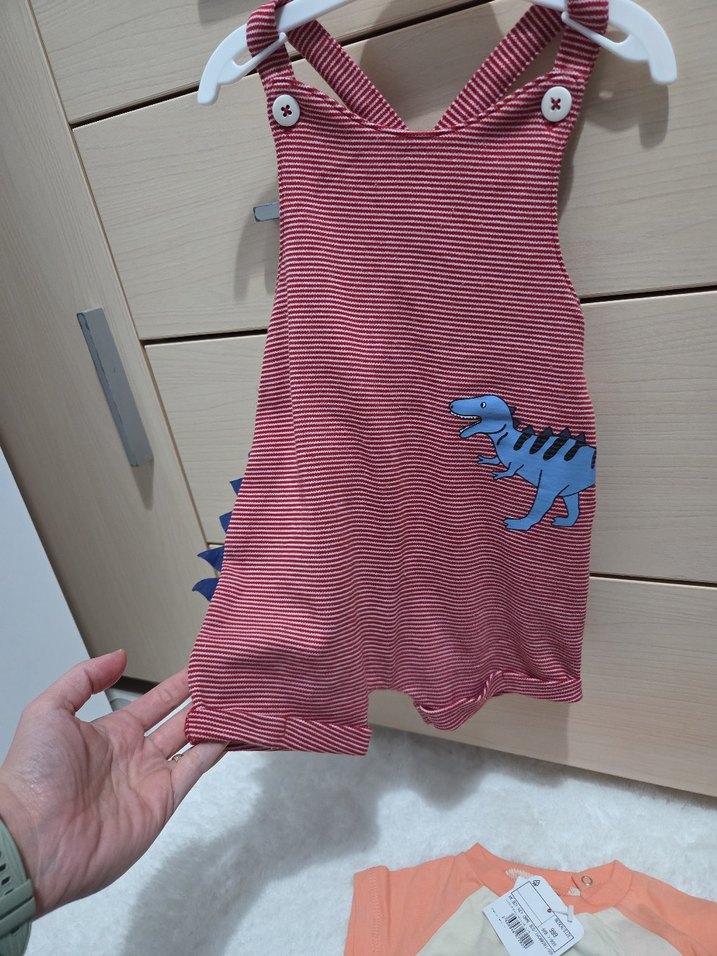 Ktaşınacağım için eşyalarımı uygun fiyata satıyorum son 15 gün. başka ihtiyaciniz varsa sorabilirsiniz. #bebek #kıyafet ırmızı çizgili, örme kumaştan, kolsuz ve dar kesim erkek çocuk tulumu, renkli dinozor baskılıdır.