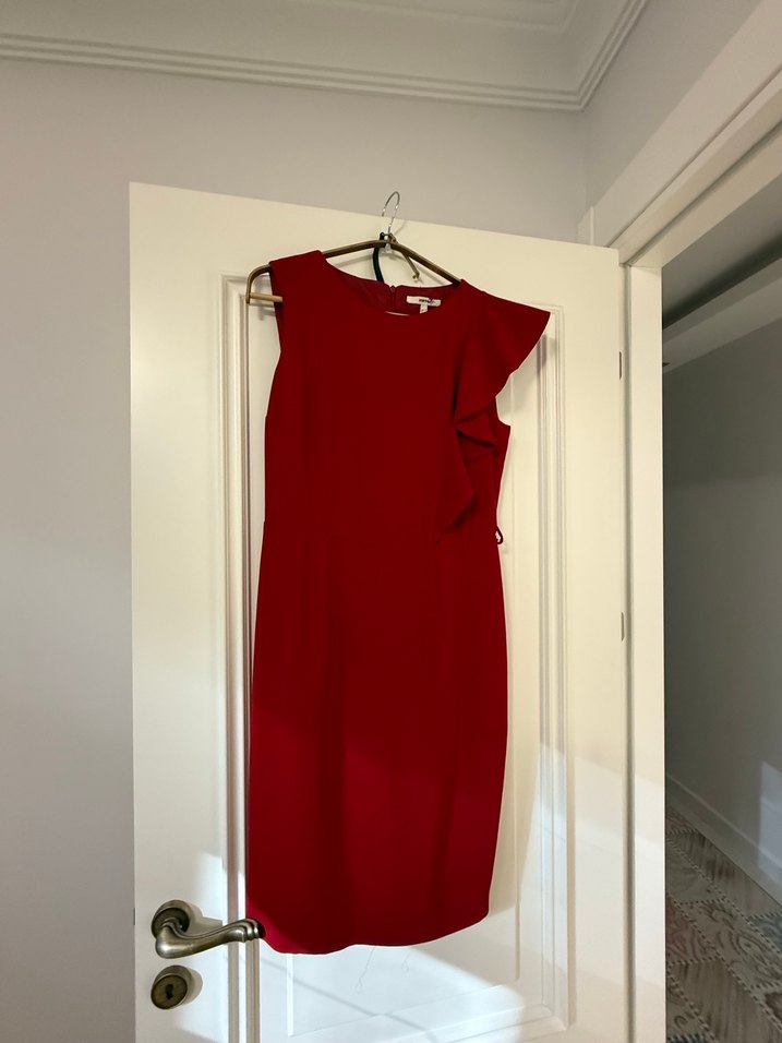 Kırmızı, drapeli detaylı ve kolsuz, straplez kesime sahip bu uzun abiye elbise, modern klasik tarzda ve ofis için uygun.hiç giyilmedi etiketi mevcut değil