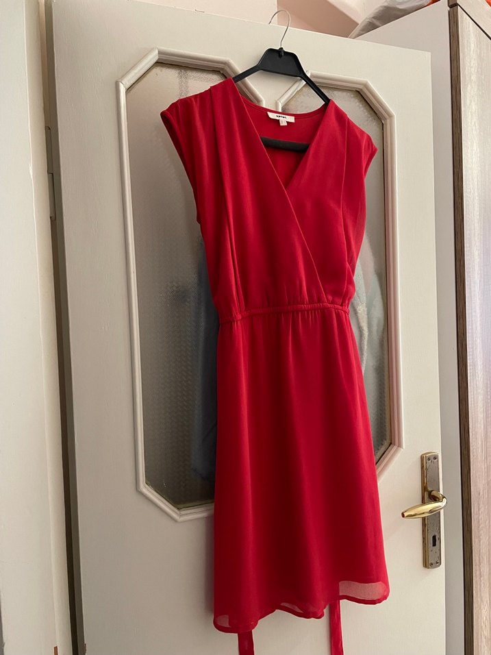 Kırmızı, drapeli V yakalı, kolsuz ve beli oturan elbisedir. Modern klasik tarzıyla romantik akşamlar için uygundur. ❤️ Yakası bana açık geldiği için o kısma çıtçıt takılmıştır.