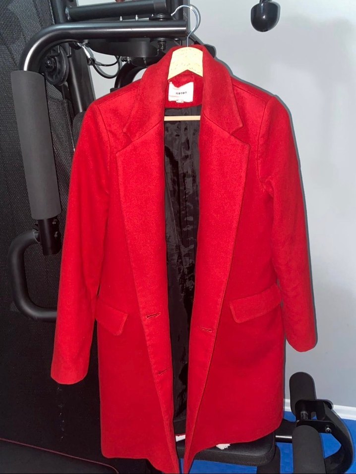 Kırmızı uzun kaban, klasik yaka ve ön ceplere sahiptir. Kullanıma bağlı tiftiklenme oluşsa bile fiyatı ona göre düşürülmüştür. 38 bedendir ama 40 bedene uygundur.