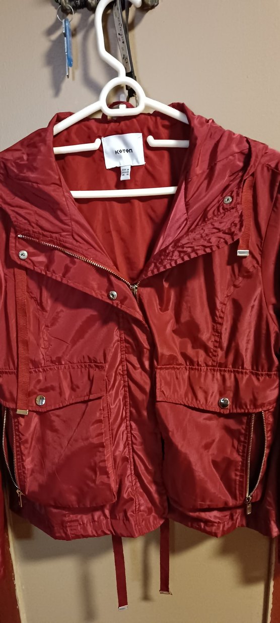 Koton markalı, parlak kırmızı sentetik kumaştan, fermuarlı ve çıtçıtlı midi uzunlukta, kesimli yakalı ve askılı kollu kadın ceket. Günlük sokak şıklığı için uygun.