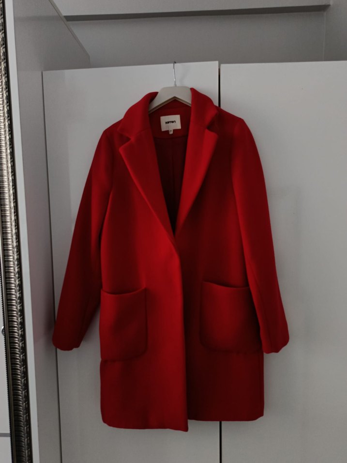 Koton markanın kırmızı yün midi kabanı, kesik yakalı ve düğmeli ön detaylıdır. Normal kesim ve uzun kolludur, ofis kullanımı için uygundur. s m uyumlu