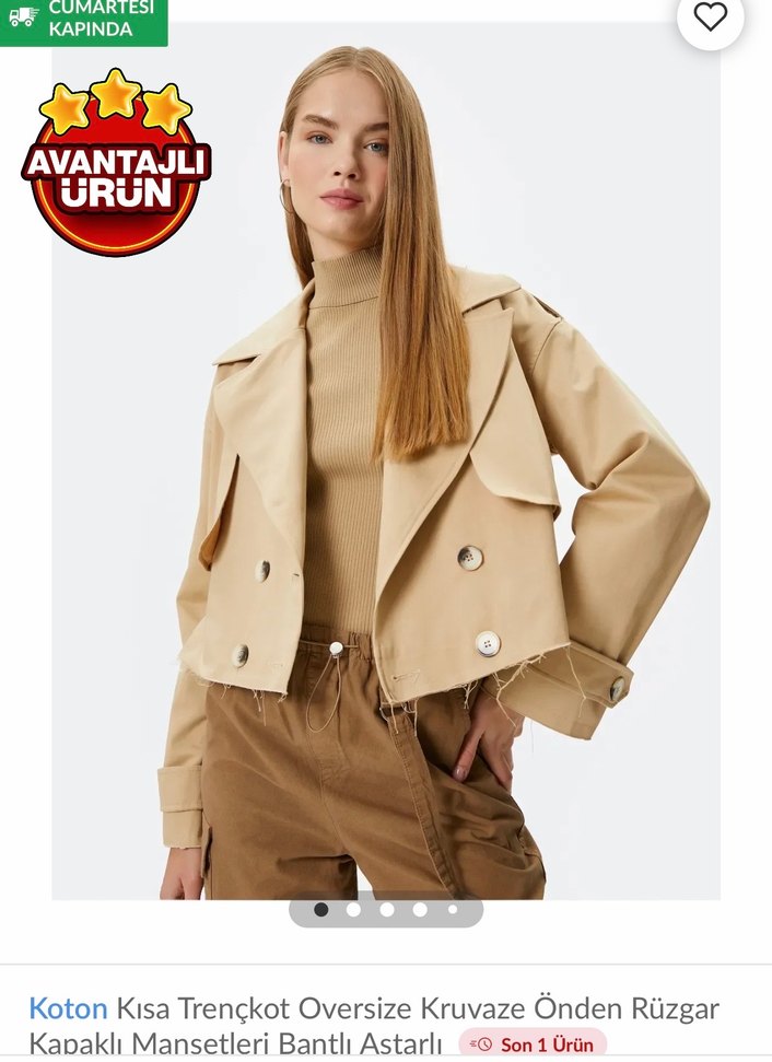 Koton markasına ait bej renk kısa trençkot, oversize kesim, kruvaze önden düğmeli ve yumuşak süet kumaştan üretilmiştir.