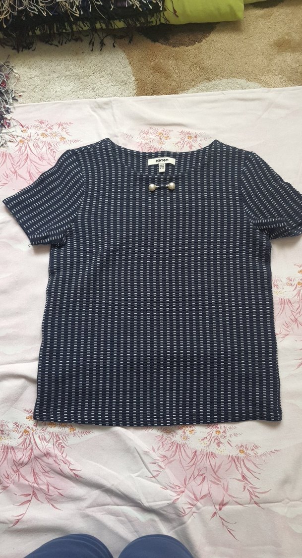 Navy renkli, kısa kollu ve yuvarlak yakalı bluz, düğmeli detaylıdır. Rahat kesimi ve desenli yapısıyla günlük kullanıma uygundur.