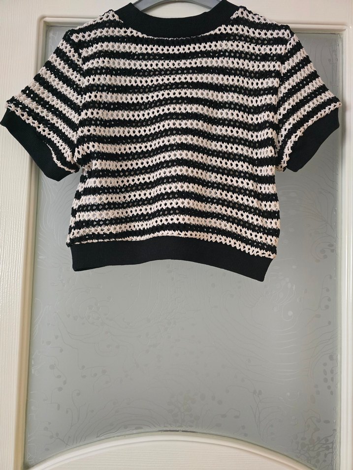 Kısa kollu ve yuvarlak yakalı örgü kadın kazak. Beyaz ve siyah çizgili, bol kesim ve normal boyda, günlük sokak stili için uygundur.