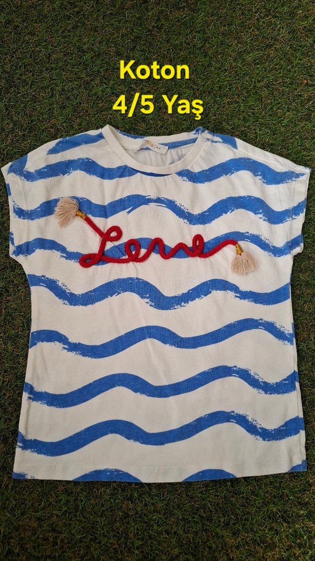 Kısa kollu, yuvarlak yaka tshirt.Mavi dalga desenleri ve örgü 'Love' yazısı ile bohem tarzda.Bir iki kez giyilmis olup,yeni ayarında tertemizdir