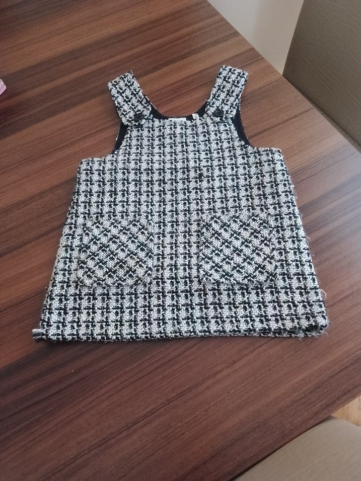 Kız çocuk için gri ekose desenli, örgü kumaştan, kolsuz ve bisiklet yaka elbisedir. Rahat kesim ve sokak stiline uygundur. küçük bir yırtığı var resimde gosterdim