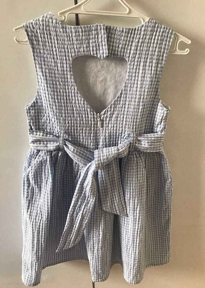 Sırtı kalp desenli,arkadan bağlamalı çok şık bir elbise.Açık mavi pitikare kumaş.Tertemizdir.Yeni gibi.