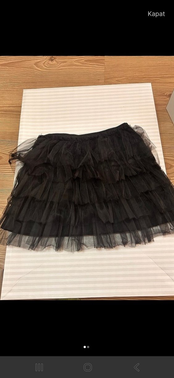 Siyah renk, sentetik kumaştan yapılmış, katmanlı volan detaylı, gotik tarzda kız çocuk eteği.