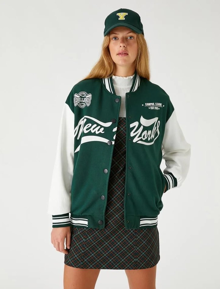 Kadınlar için uzun kollu, düğmeli, bol kesim yeşil ve gri tonlarda baskılı bomber ceket. Yumuşak ve sıcak kumaştan, günlük kullanım için uygundur.