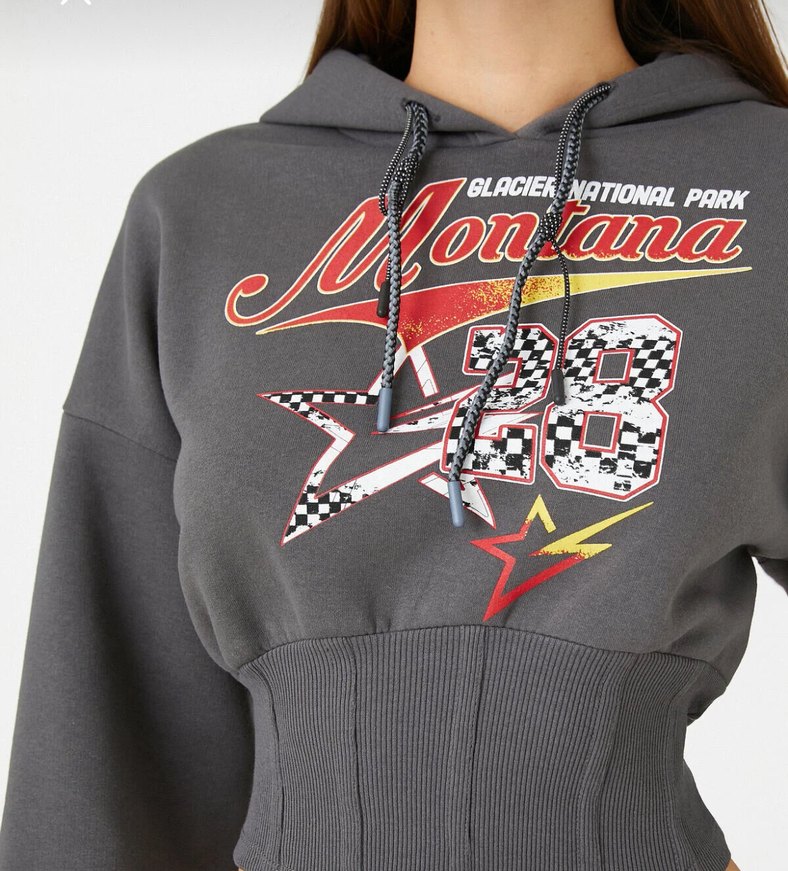 Gri renkte, zincir detaylı ve baskılı bu sweatshirt belden korselidir hiçbir sorun yok tarzıma uymadığı için satıyorum , kendi fiyatından düşüğe koydum