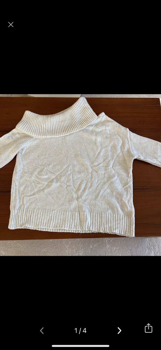 Krem renkte, örgü kumaştan, normal kesim, uzun kollu ve kayık yaka kadın kazak. Günlük kullanıma uygun rahat model.