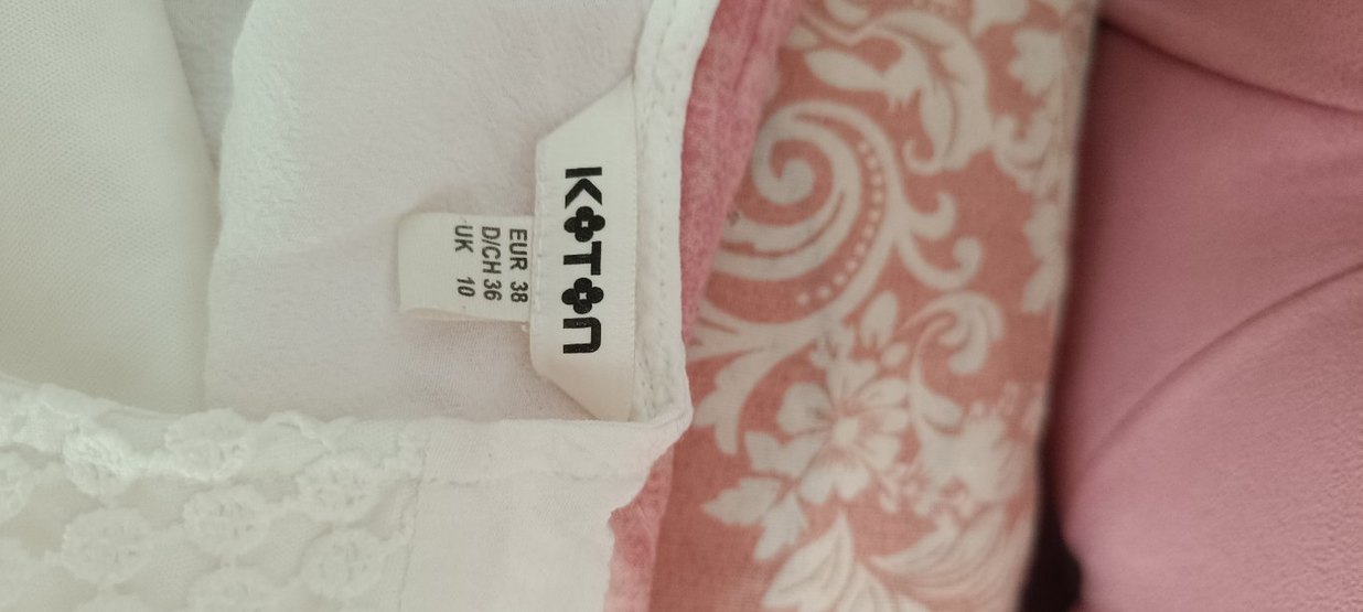 Koton marka, gri ve beyaz renklerde, normcore tarzında rozeti. Etiket üzerinde EUR38, D/CH36 beden bilgisi bulunur. ️