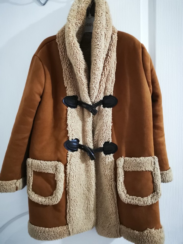 Kahverengi süet mont, kürk detaylı yakası, ön kenarları, manşetleri ve cepleriyle dikkat çeker. Notlu yaka, uzun kollu ve bol kesimdir. Tokalı kapama ve midi boyuyla rahat ve sıcak bir tarz sunar. Çok iyi durumda.5-6 yaş.
