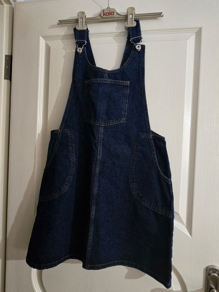 Lacivert denimden, askılı ve tokalı ayarlanabilir bantlara sahip, bol kesim midi elbise. Ön cep ve büyük yan cepleri vardır, günlük ve rahat stil için uygundur.