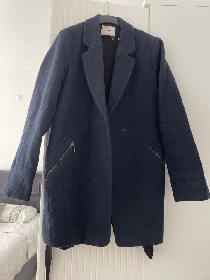 Lacivert renkli, yumuşak ve sıcak kumaştan yapılmış, yakalı ve fermuarlı yan cepleri olan şık kaban.