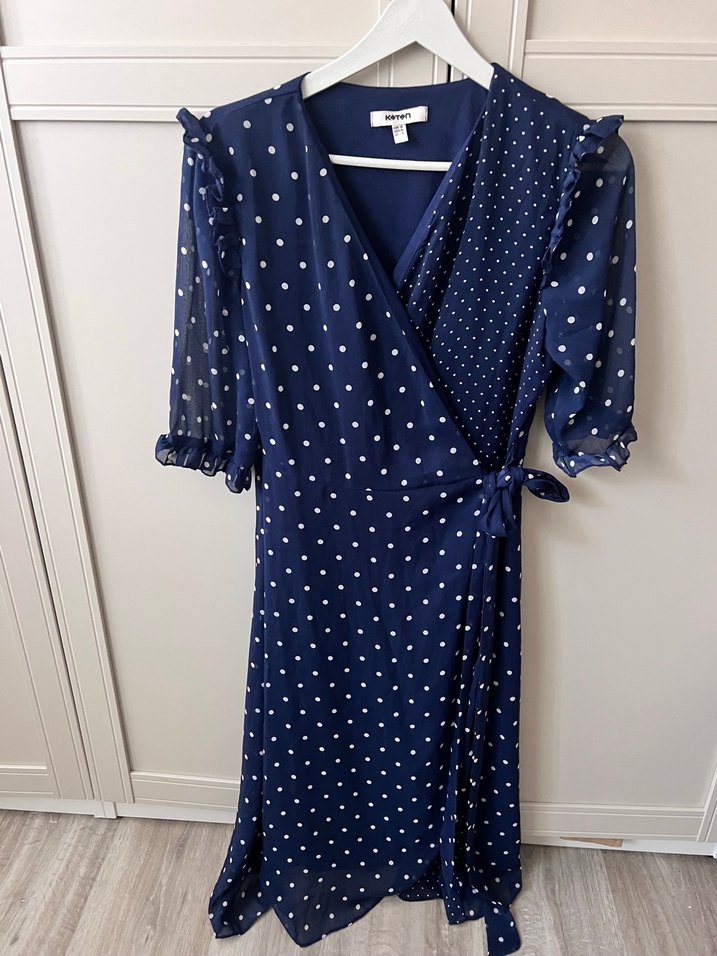 Bu lacivert puantiyeli midi elbise, drapeli ve kısa kolludur. V yaka ve kuşaklı modeliyle romantik akşamlar için uygundur. Yumuşak sentetik kumaştan üretilmiştir. Koton marka 38 beden şifon elbise