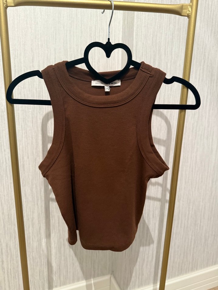 Kahverengi likralıkumaştan, bisiklet yaka ve kolsuz tasarıma sahip, midi uzunlukta, sade ve şık kadın atlet.
