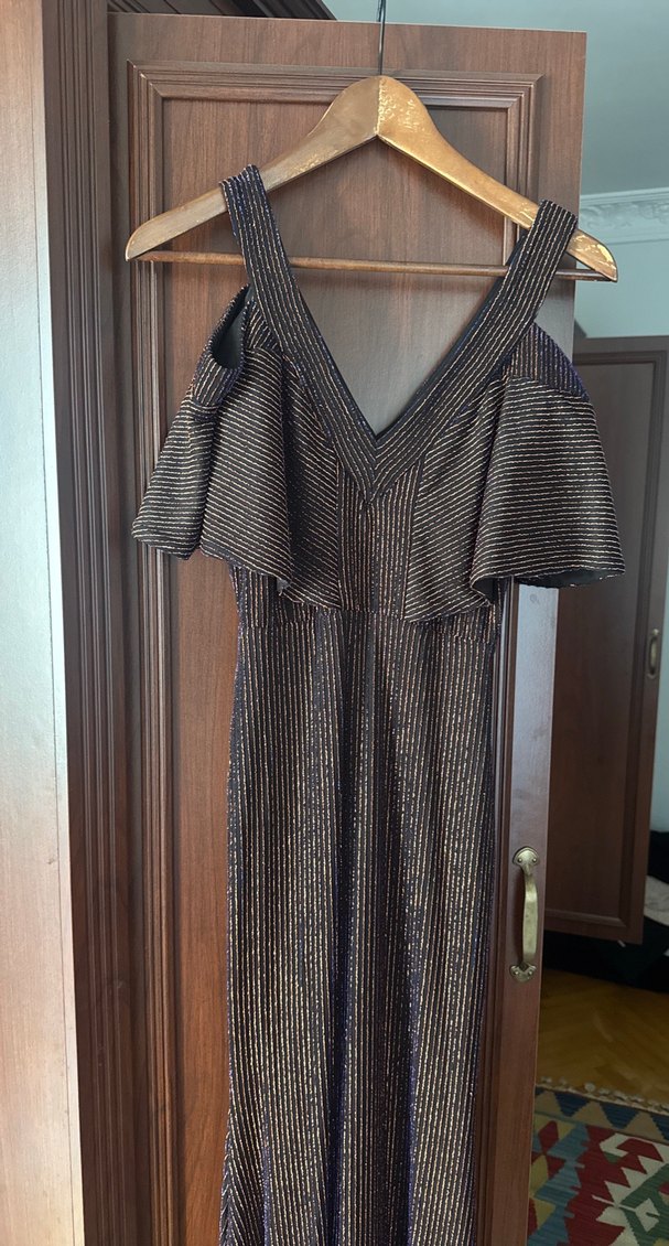 Kahverengi, parlak çizgili desenli, V yakalı, askılı, pilili uzun ve vücuda oturan abiye elbisedir. ✨