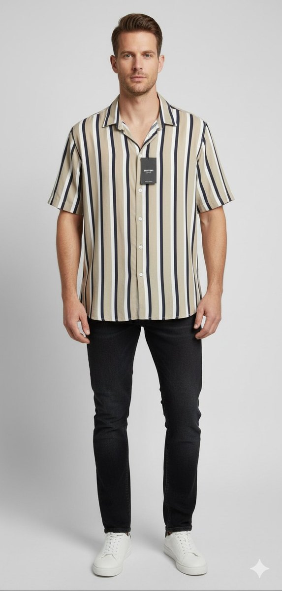 Bej çizgili, kısa kollu erkek gömlek, regular fit ve normal boyda. günlük kullanıma uygun şık bir tercih. sıfır etiketli